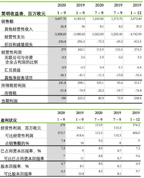 芬林集團財務報告 2020年1-9月 2020年1-9月 (與2019年1-9月相比) 銷售額為36.98億歐元(去年同期:41.83億歐元)。 經營性利潤為2.79億歐元(去年同期:3.42億歐元)。可比經營性利潤為2.74億歐元(去年同期:4.18億歐元)。 稅前利潤為2.42億歐元(去年同期:2.98億歐元)。可比稅前利潤為2.36億歐元(去年同期:3.74億歐元)。 可比已占用資本回報率為7.0%(去年同期:11.0%)。 經營現金流為4.19億歐元(去年同期:4.21億歐元)。 2020年7-9月 (與2019年7-9月相比) 銷售額為12.45億歐元(去年同期:13.74億歐元)。 經營性利潤為1.16億歐元(去年同期:1.10億歐元)。可比經營性利潤為1.15億歐元(去年同期:1.10億歐元)。 稅前利潤為1.03億歐元(去年同期:9600萬歐元)。可比稅前利潤為1.02億歐元(去年同期:9600萬歐元)。 可比已占用資本回報率為8.8%(去年同期:8.7%)。 經營現金流為1.79億歐元(去年同期:2.39億歐元)。 2020年第三季度主要事件 與上一季度相比,長纖漿的平均美元市場價格略有下降,短纖漿的平均美元市場價格保持穩定。不過,兩種漿的價格均低于去年同期。 紙板的交付量相當于去年同期水平,平均價格保持相對穩定。 集團在芬蘭艾內科斯基(Äänekoski)新落成紙板和包裝設計卓越中心(Excellence Centre)。 芬林芬寶就凱米(Kemi)生物制品廠項目簽署了廢水處理廠、二氧化氯廠和木材加工設備的初步合同。 勞馬(Rauma)鋸木廠的建設按計劃開展。 創新公司芬林之春(Metsä Spring) 和維美德(Valmet)達成協議,將在艾內科斯基建立木基3D纖維產品試驗工廠。 新冠肺炎疫情大流行 在阻止新冠疫情大流行方面,芬林集團在運營中具有三個優先重點:人員安全、履行社會責任全力參與抗擊疫情、確保業務連續性。芬林集團遵循并遵守政府機構發布的新冠疫情指南。避免身體接觸是最重要的預防措施。 在新冠疫情大流行期間,芬林集團的資源狀況保持正常。通過在工作場所實施嚴格的安全措施可以防止感染鏈。 2020年10-12月績效預測 2020年第四季度,芬林集團的可比經營性利潤預計將比2020年第三季度有所下降。 芬林集團總裁兼首席執行官何亦凱(Ilkka Hämälä)表示: “芬林集團在2020年第三季度的業績好于我們在本季度初的預期。與我們此前的估計相比,最顯著的改善來自紙板業務,其銷量高于預期且價格保持穩定。在紙漿業務方面,本季度中國市場需求回升,亞洲市場的價格變化也較為有利。木制品業務也略強于預期。到目前為止,與上一季度相比,歐洲疫情的惡化尚未反映在我們需求結構的變化中。在第三季度中,我們仍能保持工廠的正常利用率。 面對疫情大流行引起的特殊情況,集團仍按照春季采用的特殊運營模式展開運營。在我們的9000多名員工中,已檢測到30例新冠肺炎感染病例。但我們的工作場所未發現感染鏈。我們能夠按計劃繼續開展業務運營和項目開發。 停機維護已從第三季度起開始執行。我們將原定于今年上半年的停機推遲到下半年,這意味著我們所有紙漿和紙板廠將在第三和第四季度陸續組織停機維護。在第三季度中,開展停機維護的主要包括芬蘭凱米工廠和瑞典胡蘇姆 (Husum)一體化工廠,它們在特殊情況下安全地完成了工作,沒有發現新冠肺炎感染病例。 我們的開發投資項目正不斷取得進展。勞馬鋸木廠項目已從土方工程進入施工階段。設備安裝將于明年初開始。凱米生物制品廠繼續開展項目準備工作,包括實施規劃和現場準備。關于環境許可方面的決定有望在今年年底前公布,此后集團將啟動做出投資決定的準備工作。大部分主要設備購買協議已簽署,并將取決于最終的投資決定。關于胡蘇姆工廠回收鍋爐的投資決定已被推遲,原因是環境許可流程的時間長于預期,許可證有望在今年年底之前頒發。 芬林集團旗下創新公司芬林之春決定與維美德合作,在艾內科斯基建設3D纖維包裝試驗工廠。該項目旨在開發新的生產技術,用于生產高質量的纖維基包裝。這款新材料可以用來代替食品包裝中的塑料。由芬林之春和日本伊藤忠商事株式會社共同投資的紡織纖維試驗工廠已開始運營。新材料的首批測試樣品已下線,用于下一步加工階段的測試。 芬蘭集團通過運營來滿足人們對可再生材料制成產品的日常需求。我們正積極開展運營,更好地結合與北歐森林有關的生態和經濟目標,持續改進我們的生產和運營流程,為消費者推出可再生、資源效率更高的產品。” 關鍵數據