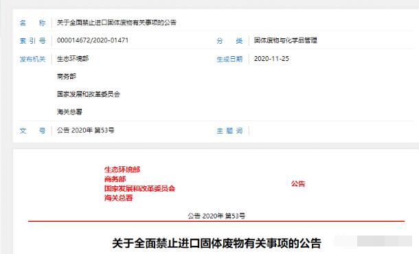 11月25日,生態(tài)環(huán)境部、商務部、國家發(fā)展和改革委員會、海關總署發(fā)布《關于全面禁止進口固體廢物有關事項的公告》(下稱《公告》)稱,禁止以任何方式進口固體廢物。公告自2021年1月1日起施行。 《中華人民共和國固體廢物污染環(huán)境防治法》于2020年4月29日,已由第十三屆全國人民代表大會常務委員會第十七次會議修訂通過,自2020年9月1日起施行。為貫徹落實《中華人民共和國固體廢物污染環(huán)境防治法》有關固體廢物進口管理的修訂內(nèi)容,做好相關銜接工作,現(xiàn)將有關事項公告如下。 一、禁止以任何方式進口固體廢物。禁止我國境外的固體廢物進境傾倒、堆放、處置。 二、生態(tài)環(huán)境部停止受理和審批限制進口類可用作原料的固體廢物進口許可證的申請;2020年已發(fā)放的限制進口類可用作原料的固體廢物進口許可證,應當在證書載明的2020年有效期內(nèi)使用,逾期自行失效。 三、海關特殊監(jiān)管區(qū)域和保稅監(jiān)管場所(包括保稅區(qū)、綜合保稅區(qū)等海關特殊監(jiān)管區(qū)域和保稅物流中心(A/B型)、保稅倉庫等保稅監(jiān)管場所)內(nèi)單位產(chǎn)生的未復運出境的固體廢物,按照國內(nèi)固體廢物相關規(guī)定進行管理。需出區(qū)進行貯存、利用或者處置的,應向所在地海關特殊監(jiān)管區(qū)域和保稅監(jiān)管場所地方政府行政管理部門辦理相關手續(xù),海關不再驗核相關批件。 四、海關特殊監(jiān)管區(qū)域和保稅監(jiān)管場所外開展保稅維修和再制造業(yè)務單位生產(chǎn)作業(yè)過程中產(chǎn)生的未復運出境的固體廢物,參照第三款規(guī)定執(zhí)行。 本公告自2021年1月1日起施行。原環(huán)境保護部、海關總署、原質(zhì)檢總局辦公廳《關于加強固體廢物進口管理和執(zhí)法信息共享的通知》(環(huán)辦〔2011〕141號),原環(huán)境保護部、發(fā)展改革委、商務部、海關總署、原質(zhì)檢總局2015年第69號公告,原環(huán)境保護部、商務部、發(fā)展改革委、海關總署、原質(zhì)檢總局2017年第39號公告,生態(tài)環(huán)境部、商務部、發(fā)展改革委、海關總署2018年第6號公告,生態(tài)環(huán)境部、商務部、發(fā)展改革委、海關總署2018年第68號公告同時廢止。 截至目前,今年共審批進口廢紙合計總量674.8740萬噸,前九個月累計實際進口448萬噸,結合目前的海運狀況和國外形勢,許可證中的一部分廢紙將無法在年內(nèi)完成入關,只能作廢。