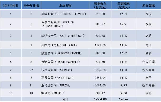 需要指出的是,2021年預測的1397.68億美元的美國印刷總需求,相比于2020年榜單中的2076.06億美元下降不少,這也在一定程度上反映出新冠肺炎疫情等因素對于美國市場印刷需求的影響。 細分領域呈現新變化 盡管新冠肺炎疫情、街頭暴力、國債翻倍以及選舉焦慮給美國經濟帶來了沖擊,但在這一“失落之年”背后,美國印刷買家百強企業也有一些新的變化,最明顯的領域是多家物流/貨運實體組成了寡頭壟斷。 此外,在百強印刷買家企業中,健康以及食品/飲料領域的印刷需求占比最高,分別為27.2%和19.2%。這兩大領域占據了標簽和包裝超過1/5的市場。 榜單中,前25家企業的印刷需求占到百強印刷買家企業全部印刷需求的近一半,并可能超過美國全部印刷需求的1/6。而且,整體印刷增長將集中在個人護理、醫療/制藥和安全/安保領域。而飽受疫情困擾的餐飲服務領域最多只能恢復到以前規模的2/3。 受永久性影響最嚴重的領域將是商業和零售房地產(預計下降28%),以及任何依賴進口或外國人的活動。汽車、時尚、旅游/酒店和高等教育領域的印刷需求可能下降1/4甚至更多。 前10強印刷買家變化多 總的來看,本次榜單中的前10名企業與2020年榜單基本一致。 時隔一年,美國郵政局(U.S.POSTAL SERVICE)取代美國電話電報公司(AT&T)重回榜首;輝瑞制藥公司(PFIZER INC.)、ULINE公司和麥當勞公司(MCDONALD’S CORP.)跌出前10,而沃爾瑪公司(WALMART)、亞馬遜公司(AMAZON)以及3M公司(3M CO.)取而代之進入前10名。 下面,就讓我們著重分析本次榜單前10名企業,及其同領域競爭對手企業2021年印刷需求變化情況。 榜單顯示,美國郵政局將成為史上最大的印刷買家,并重回榜首地位。根據預測,2021年,美國郵政局營業收入為712億美元,同比增長6%;印刷需求達到19.78億美元,同比增長33%。優先郵件、包裹以及國際郵件和運輸服務將在未來兩年中脫穎而出。 與之對比,另一家物流巨頭聯邦快遞(FEDEX CORP.),以8億美元的印刷需求和27%的增長率排在第21位;UPS排在第40名,印刷需求為5.56億美元,同比下降9%。 百事國際集團(PEPSICO INTERNATIONAL)以16.97億美元的印刷需求排在第二名,印刷需求同比增長超過40%。受益于疫情導致的在家時間增多,百事國際集團的零食和軟飲料銷售得到增長,再加上對替代品牌和酒精飲料品牌的收購,正使其成為大型軟包裝、金屬裝飾和零售點的需求者。 這一成功在很大程度上是以其競爭對手、排名在第48位的可口可樂公司(COCA-COLA COMBINED)11%的印刷需求下降為代價的。2021年,預計可口可樂公司的印刷需求為5.2億美元。 華特迪士尼公司(WALT DISNEY CO.)則占據前三甲的最后一個位置。2021年,華特迪士尼公司的印刷需求為14.43億美元,同比2020年增長43.09%。 排名第四的企業是美國電話電報公司(AT&T),該企業在2020年的榜單中一度以14.92億美元的印刷需求居于榜首。2021年其印刷需求為13.24億美元,同比下降13%。同時,美國電話電報公司總營業收入預計也將下降7%。該公司正在削減包括印刷在內的可自由支配成本,并終止其在美國東西海岸娛樂業務的創意職位。 強生公司(JOHNSON&JOHNSON)則位列第五。2021年,該公司的印刷需求預計為12.85億美元,同比增長17%。強生公司承諾在“非盈利的基礎上”生產新冠病毒疫苗,但隨之而來的是包裝成本的增加。2021年,強生公司在標簽和包裝領域的需求量將超過9億美元,其消費者健康產品,尤其是衛生和防護類產品,將繼續增長20%以上。 與強生公司同處制藥領域,在2020年榜單中排在第七位的輝瑞制藥公司,在2021年榜單中僅排在第15位,其印刷需求為9.10億美元,同比下降9%。不久前,輝瑞制藥推出的新冠病毒疫苗被推上熱搜。據悉,該疫苗能夠阻止90%的新冠病毒感染,并有望在今年年底和明年年初得到大規模推廣,屆時能否帶來印刷需求的增加仍需觀察。 寶潔公司(PROCTER&GAMBLE)排在第六位,相比2020年提升了2個名次,其2021年的印刷需求為10.39億美元,同比增長5%。后疫情時代,人們更加注重衛生工作,這也為寶潔公司印刷需求的增加提供了諸多利好。 沃爾瑪公司(WALMART)從2020年的第27位,上升到2020年的第7位,漲幅可謂前10名之最。2021年,沃爾瑪公司的印刷需求預計為10.10億美元,同比增長57%。這一傳統的大型超市并沒有受到疫情影響,其電子商務收入反而增長73%。相比之下,其競爭對手好市多(COSTCO)的印刷需求卻下降了7%,僅以4.90億美元排在第52位。 蘋果公司(APPLE INC.)則下降兩位,來到第8名,也是前10名中唯一的電子領域企業。盡管iphone12手機在功能上升級頗多,市場反響也良好,但受制于疫情導致的換機周期延長和蘋果包裝的減量化處理,2021年蘋果公司的印刷需求為10.13億美元,同比去年下降了近4%。 零售商亞馬遜排在第9位,名次上升2位。其2021年的印刷需求將上漲5%,達到9.93億美元。據分析者指出,亞馬遜很快將成為美國第四大直接交貨承運人和瓦楞紙箱制造商,其基于互聯網的跨界發展能力依然備受關注。 此外,在這份榜單中,菲亞特克萊斯勒美國公司(FCA FIAT CHRYSLER AMERICA),以2.15億美元的印刷需求排在第100名。