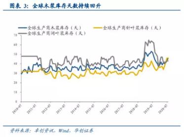截至2020年8月底,全球漿廠木漿庫存為46天,環(huán)比增加2天,持續(xù)回升。