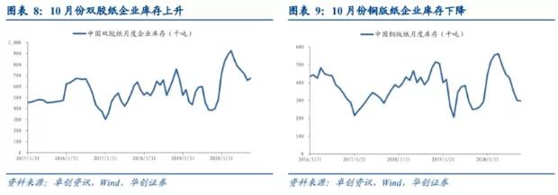 截至2020年11月2日,針葉漿外盤平均價格為620美/噸,折合人民幣4154.00,環(huán)比上升0.28%,同比上升0.13%;闊葉漿外盤平均價格為465.00美/噸,折合人民幣3115.50,環(huán)比上升1.99%,同比下降7.91%。 雙膠庫存上升,銅板庫存下降,價格上升,白卡紙市場10月表現(xiàn)持續(xù)改善。 截至2020年11月2日,銅版紙價格環(huán)比回升90/噸至5560/噸,雙膠紙價格環(huán)比回升25/噸至5512.5/噸;白卡紙價格為6614.29/噸,環(huán)比上漲0.71%,同比上漲16.40%。