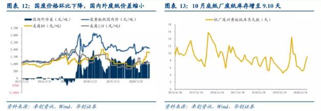 10月國內(nèi)廢紙價格環(huán)比下降,紙廠黃板紙庫存增加。 截至2020年11月2日,國內(nèi)廢黃板紙價格為2102.5/噸,環(huán)比下降1.75%,同比上升7.68%;國內(nèi)外廢紙價差縮小至1007.05/噸,環(huán)比下降3.39%,同比下降15.80%;20年1月紙廠廢舊黃板紙庫存呈現(xiàn)上升走勢,主要是紙廠春節(jié)備貨和疫情影響的原因,復工后紙企出貨速度加快庫存減少,7月起庫存持續(xù)回升,2020年10月底廠商黃板紙庫存增至9.10天,環(huán)比上升1.60天,本月紙廠廢紙到貨量季節(jié)性短暫增長,紙廠備庫意識積極兌現(xiàn)。