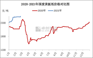 據卓創資訊監測數據顯示,2月國廢黃板紙均價為2486元/噸,月環比上漲3.71%,月同比上漲15.15%。2月國廢黃板紙到廠價繼續上漲,僅春節假期期間價格穩定,因市場交投停止。國外疫情升溫后,海運運力下降、運費上漲,促使進口原料價格上漲,包括廢紙漿、成品紙、紙漿的進口價格,在此背景下,加2021年之進口廢紙數量清零,那么大型紙廠積極增加國產廢紙庫存儲備以應對原料供應缺口。這使得國內廢黃板紙市場長期處于供小于求狀態,促使其市場價格的連續上漲。