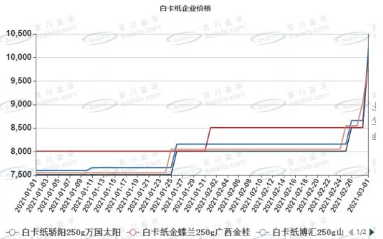 導(dǎo)語:漿價和紙價還要漲到什么時候呢?有分析師預(yù)測針葉漿的下一個目標(biāo)將是8000元,而紙價隨著特種紙全面過萬元之后,已經(jīng)站穩(wěn)8000元的白卡紙也將向萬元的歷史高位沖擊! 1、一天之內(nèi),國內(nèi)白卡紙價格突破萬元大關(guān) 3月1日,白卡紙市場突然發(fā)力漲價,APP金桂和寧波中華紙業(yè)漲價1800元/噸,博匯紙業(yè)漲價1000元/噸,其他白卡紙生產(chǎn)企業(yè)紛紛跟漲1000元/噸,一天的時間,國內(nèi)白卡紙價格即突破了萬元大關(guān)。 1、湛江晨鳴、山東晨鳴白卡漲1000元/噸 2、山東博匯、江蘇博匯白卡漲1000元/噸 3、萬國紙業(yè)白卡漲1000元/噸 4、新鄉(xiāng)新亞紙業(yè)白卡漲1000元/噸 5、廣西金桂紙業(yè)白卡漲1800元/噸 6、寧波中華紙業(yè)白卡漲1800元/噸 回顧本輪漲價來看:1月下旬,APP、晨鳴、博匯、太陽主力紙廠發(fā)布2、3月漲價函。宣布2月、3月接單價格分別提漲500元/噸。春節(jié)前,2月漲價如期落實(shí),白卡紙價格站穩(wěn)8000元線。春節(jié)后,隨著紙漿價格一路走高,造紙系列產(chǎn)品全線拉漲。白卡紙?jiān)竟⿷?yīng)緊張,加之3月漲價500元的通知已發(fā),中下游節(jié)后備貨積極,紙廠門口排隊(duì)現(xiàn)象嚴(yán)重。春節(jié)期間累積的庫存迅速降至低位,個別紙廠表示近期一直無庫存。2月中下旬紙廠報(bào)價維持月初訂單價格,貿(mào)易商方面率先拉漲市場成交價格500-800元/噸,截止2月23日,白卡紙市場主流成交價格漲至8700-8800元/噸。 2月25日開始,紙廠方面陸續(xù)開始接3月新單,簽單價格較前期提漲500元/噸。周末至今,幾大紙廠陸續(xù)追漲兩次,漲幅分別是500元和800元/噸。截止發(fā)稿,3月較2月接單價格漲幅由原定的500元/噸擴(kuò)大到1800元/噸附近。自此主流品牌白卡紙報(bào)價達(dá)到10000元/噸。
