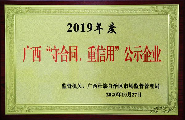 “廣西守合同重信用企業”榮譽的再次獲得,是市場監管部門以及社會各界對企業誠信經營的進一步肯定,對提升企業形象及品牌影響力具有積極意義。