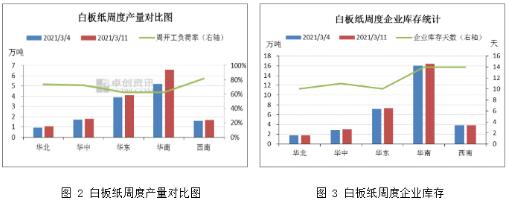首先,從供需面看,總體供應略大于需求。如圖2、圖3所示,截至3月11日白板紙紙廠周度開工負荷率較上周上升9.07個百分點,節后多數紙廠已于復工復產,因此總體產量略有增加。然下游采購積極性不佳,貿易商謹慎拿貨,紙廠出貨情況整體一般,因此紙廠庫存窄幅增加。