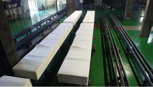 成品 成型的漿板由切紙機切分成一定重量大小的規格,然后再輸送到每一條包裝線。 為了運輸方便,傳輸帶上都是成品漿板,它們都是經過白度和污點評判等級而篩選出的。 設備基本上全自動運行,一天的產量可有3000噸。除了機器檢修期間除外,其他時間都在不間斷的運行中。