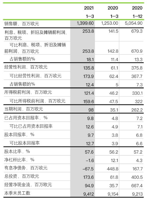 2021年1-3月(與2020年1-3月相比) . 銷售額為14億歐元(去年同期:12.53億歐元)。 . 經營性利潤為1.36億歐元(去年同期:6100萬歐元)。可比經營性利潤為1.74億歐元(去年同期:6200萬歐元)。 . 稅前利潤為1.21億歐元(去年同期:4600萬歐元)。可比稅前利潤為1.60億歐元(去年同期:4800萬歐元)。 . 可比已占用資本回報率為12.6%(去年同期:4.9%)。 . 經營性凈現金流為9500萬歐元(去年同期:3600萬歐元)。 2021年第一季度主要事件 . 與上一季度相比,長纖漿和短纖漿以美元計算的市場均價都出現增長。 . 紙板交付量達到歷史新高,需求保持旺盛。 . 芬林芬寶做出建設芬蘭凱米(Kemi)新生物制品工廠的投資決定。投資額約為16億歐元。  凱米(Kemi)生物制品工廠 . 芬林紙板啟動瑞典胡蘇姆(Husum)工廠擴建前期工程,擴建后工廠的折疊紙板年產能將增加約20萬噸。  胡蘇姆(Husum)工廠 . 芬林紙板將胡蘇姆木漿廠30%的股份出售給NorraSkog。 . 芬林集團啟動一項耗資1.5億歐元的項目,以更新其企業資源計劃(ERP)系統。 . 芬林之春(MetsäSpring)推出紡織纖維品牌Kuura。  芬林紡織纖維品牌Kuura 新冠肺炎疫情大流行 在阻止新冠疫情大流行方面,芬林集團在運營中抓住三個重點:人員安全、履行社會責任全力參與抗擊疫情、確保業務連續性。芬林集團遵循并遵守政府機構發布的新冠疫情指南。避免身體接觸是最重要的預防措施。在新冠疫情大流行期間,芬林集團的資源供應保持正常。除了一些例外情況,生產和交貨均保持正常。 本季度以后發生的事件 SariPajari-Sederholm被任命為芬林集團戰略執行副總裁,此項任命將于2021年5月1日生效。她于2007年加入芬林集團,曾任芬林集團首席信息官,并任職于芬林紙板的多個管理崗位。在此項新任命前,Pajari-Sederholm擔任芬林紙板銷售及市場高級副總裁。在新職位上,Pajari-Sederholm將負責芬林集團的戰略規劃、籌備和執行支持、以及各項業務發展計劃。