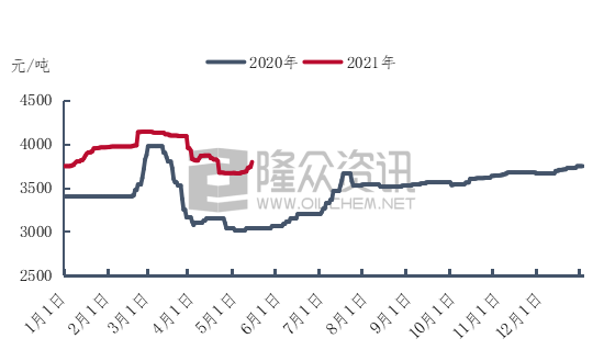 從上表可以看出,進入5月中旬,瓦楞紙及箱板紙?zhí)醿r速度加快。5月中旬提價3次,第一次提漲瓦楞紙,第二次提漲箱板紙,前兩輪提價瓦楞紙和箱板紙分開。第三輪為瓦楞紙和箱板紙一起提價,此現(xiàn)象表明紙廠出貨情況整體良好,提價落地可能性增大。且第三輪提漲金額由前兩輪的50-100元/噸擴大至100-200元/噸。 近兩年瓦楞紙價格走勢對比 今年瓦楞紙價格走勢與2020年走勢非常相似。一季度末大漲,二季度初大幅下滑,紙價下跌后水平超過上漲前的低價。2020年一季度最高價為3974元/噸,二季度最低價為3011元/噸,跌幅為24.23%。2021年一季度瓦楞紙最高價為4138元/噸,較二季度的最低點3663元/噸下跌11.48%。2020年5月初紙價開始進入上行階段,一直持續(xù)至年底(7月中旬短暫下跌后再次進入上行通道)。今年紙價上漲階段亦為5月中旬,然今年紙價漲幅較去年擴大。2020年5月份瓦楞紙上漲50元/噸,漲幅為1.66%。今年僅5月中旬瓦楞紙上漲金額為300元/噸左右,漲幅為9.01%,漲幅較去年明顯擴大。 全國瓦楞紙均價走勢圖