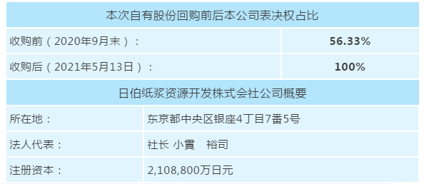王子控股株式會社自去年開始推進合并子公司日伯紙漿資源開發株式會社自有股份的回購,于近日取得了該公司另一股東伊藤忠商事株式會社所持有的全部股份。自此,除我集團公司持有的股份之外,所有該公司的自有股份已全部回購完成。  日伯紙漿資源開發株式會社是1971年由日本11家制漿造紙廠商和伊藤忠株式會社為活用巴西桉樹人工林生產紙漿而共同出資成立的企業。1973年,與巴西的國控公司RioDoce公司共同在MinasGerais州成立了紙漿生產公司CeluloseNipo-BrasileiraS.A.(下稱CNB),2001年,日伯紙漿資源開發株式會社從RioDoce公司取得所有CNB的股份,使CNB公司成為其全資子公司。 2020年9月30日,日伯紙漿資源開發株式會社與伊藤忠商事株式會社簽訂了自有股份回購協議,有意取得其所持有的公司全部自有股份。此后,開始辦理股份轉讓手續,于2021年5月13日取得了該公司持有的全部股份。 CNB公司目前持有桉樹人工林地14.6萬公頃,年產闊葉漿120萬噸。是支撐我集團公司海外紙漿事業戰略的主力公司,預計今后也將為集團公司的收益繼續貢獻力量。我們也將用好該公司的100%表決權,靈活推進事業運營,進一步擴大事業。