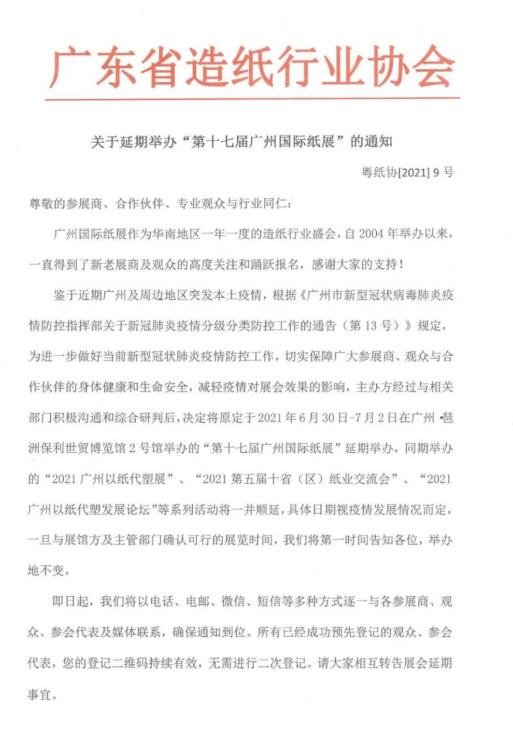 尊敬的參展商、合作伙伴、專業觀眾與行業同仁: 鑒于近期廣州及周邊地區突發本土疫情,根據《廣州市新型冠狀病毒肺炎疫情防控指揮部關于新冠肺炎疫情分級分類防控工作的通告(第13號)》規定,為進一步做好當前新型冠狀肺炎疫情防控工作,切實保障廣大參展商、觀眾與合作伙伴的身體健康和生命安全,減輕疫情對展會效果的影響,主辦方經過與相關部門積極溝通和綜合研判后,決定將原定于2021年6月30日-7月2日在廣州·琶洲保利世貿博覽館2號館舉辦的“第十七屆廣州國際紙展”延期舉辦,同期舉辦的“2021廣州以紙代塑展”、“2021第五屆十省(區)紙業交流會”、“2021廣州以紙代塑發展論壇”等系列活動將一并順延,具體日期視疫情發展情況而定,一旦與展館方及主管部門確認可行的展覽時間,我們將第一時間告知各位,舉辦地不變。  即日起,我們將以電話、電郵、微信、短信等多種方式逐一與各參展商、觀眾、參會代表及媒體聯系,確保通知到位。所有已經成功預登記的觀眾、參會代表,您的登記二維碼持續有效,無需進行二次登記。請大家相互轉告展會延期事宜。 本屆展會已籌備一年多,各項工作均已準備就緒,但目前疫情形勢嚴峻,為了大家的安全健康和切身利益著想,我們不得不做出這個艱難決定。對此給大家造成不便我們深表歉意,希望得到大家的理解和支持。 如有任何疑問,歡迎隨時與我們聯系,廣東省造紙行業協會020-81360396,奧馳展覽020-83392687。官網www.paperexpo.com.cn,微信公眾號“廣州國際紙展”,將及時發布最新信息。 積極面對,砥礪前行!新展期一經確定,我們一定會全力以赴地做好展會宣傳推廣和觀眾邀請工作,以及同期會議論壇和相關活動的組織籌備工作,為大家呈現一場成功、精彩、圓滿的專業盛會。