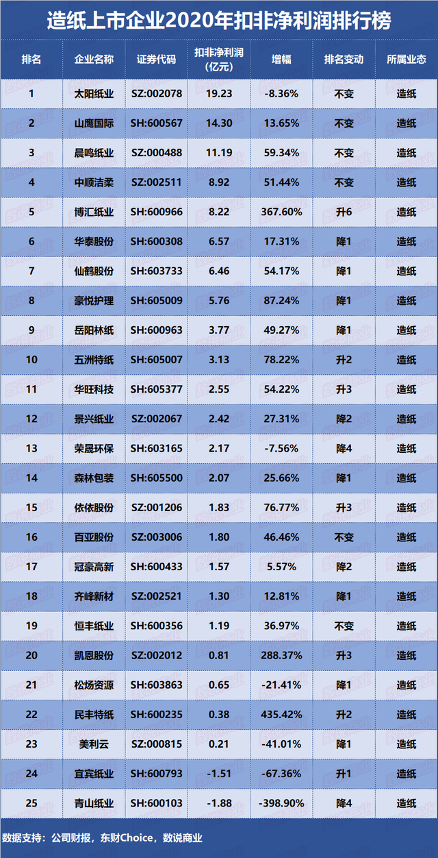 ▲造紙上市企業2020年凈利潤排行榜 從凈利潤規模來看,太陽紙業、晨鳴紙業、山鷹國際等3家企業凈利潤在10億元以上;中順潔柔、博匯紙業、仙鶴股份等在內的16家企業凈利潤均不足10億元; 凱恩股份、青山紙業、松煬資源、美利云、民豐特紙等5家企業凈利潤均不足1億元;宜賓紙業唯一虧損。 從凈利潤增幅來看,有19家企業凈利潤實現正增長,其中15家企業增幅在兩位數以上,博匯紙業和民豐特紙實現倍數增長,博匯紙業增長最快,凈利潤增幅達到523.50%。 其余6家企業凈利潤均為下滑,其中太陽紙業、松煬資源、青山紙業、宜賓紙業等4家企業下滑均在兩位數以上,宜賓紙業下滑最大,凈利潤下滑達到906.00%。 扣非凈利潤 扣非凈利潤扣除了在經營過程中的支出以及與經營過程無關的支出,更加客觀的看到一個公司的經營狀況。據數說商業統計,造紙上市企業2020年扣非凈利潤總額為103.11億元,較上年同期的79.70億元,增加23.41億元,同比增長29.37%。平均扣非凈利潤由上年同期的3.19億元增加至4.12億元。