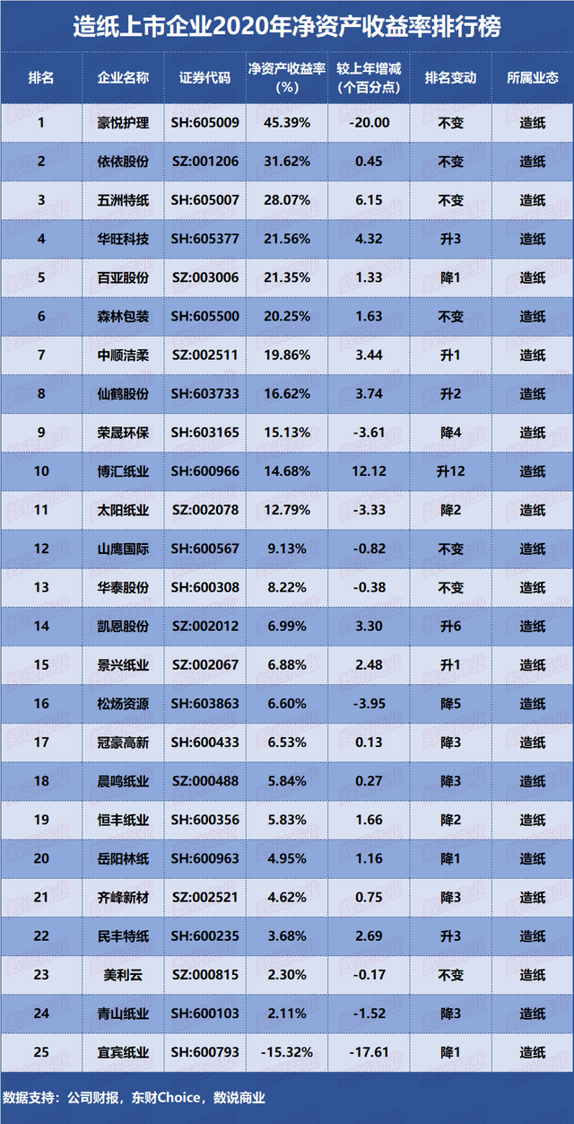 ▲造紙上市企業2020年扣非凈利潤排行榜 從扣非凈利潤規模來看,太陽紙業、山鷹國際、晨鳴紙業等3家企業扣非凈利潤在10億元以上;中順潔柔、博匯紙業、華泰股份等在內的16家企業扣非凈利潤不足10億元; 凱恩股份、松煬資源、民豐特紙、美利云等4家企業扣非凈利潤不足1億元;宜賓紙業和青山紙業均為虧損。 從扣非凈利潤增幅來看,有19家企業扣非凈利潤實現正增長,其中18家企業增幅在兩位數以上,民豐特紙、博匯紙業、凱恩股份等3家企業實現倍數增長,民豐特紙增長最快,扣非凈利潤增幅達到435.42%。 其余6家企業扣非凈利潤均為下滑,其中松煬資源、美利云、宜賓紙業、青山紙業等4家企業下滑在兩位數以上,青山紙業下滑最大,扣非凈利潤下滑達到398.90%。 凈資產收益率 凈資產收益率體現了自有資本獲得凈收益的能力,是衡量股東資金使用效率的重要財務指標。據數說商業統計,造紙上市企業2020年平均凈資產收益率為12.23%,較上年同期的12.46%,減少0.23個百分點。