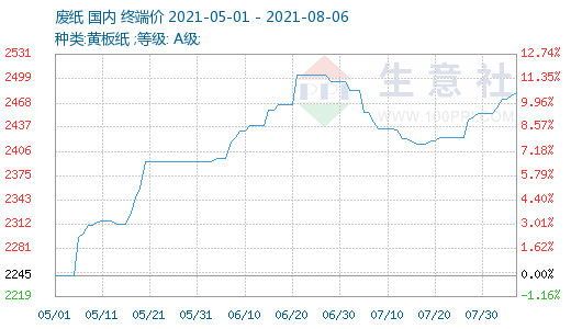 據(jù)此前山鷹國際發(fā)布公告顯示,2021年7月,公司國內(nèi)造紙銷量達(dá)48.95萬噸,同比增長0.85%,包裝銷量達(dá)1.73億平方米,同比增長25.63%。1至7月,國內(nèi)造紙銷量達(dá)330.15萬噸,同比增長41.32%,包裝銷量達(dá)11.2億平方米,同比增長50.13%。公司產(chǎn)能規(guī)模擴大,產(chǎn)品市場占有率提升,行業(yè)綜合競爭力逐步增強。 廢紙瓦紙價格同步上漲短期可能偏強走勢