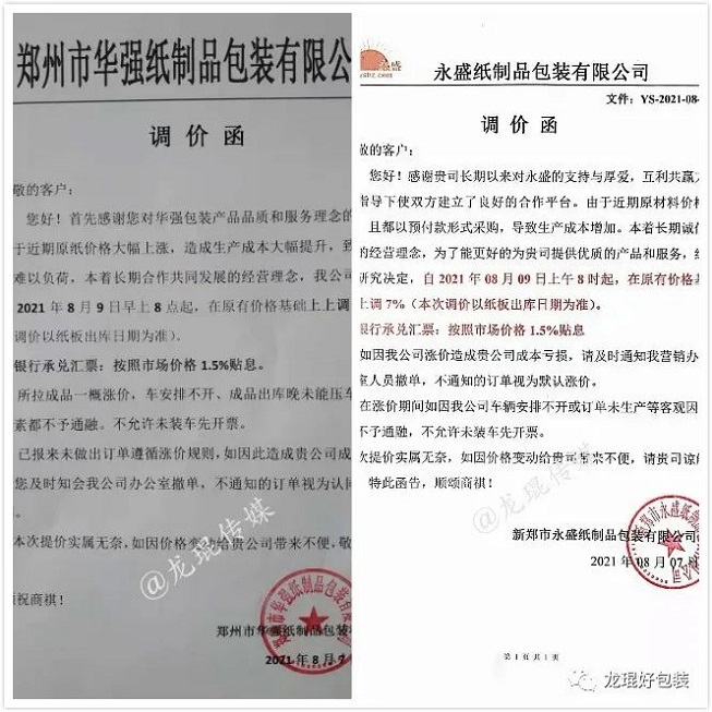 單次漲幅同樣達7%的,還有鄭州市華強紙制品包裝有限公司和新鄭市永盛紙制品包裝有限公司。從漲價函中可以看到,這兩家企業除了宣布漲價外,還明確指出車安排不開、成品出庫晚、未能壓車等客觀因素都不予通融,不允許未裝車先開票。