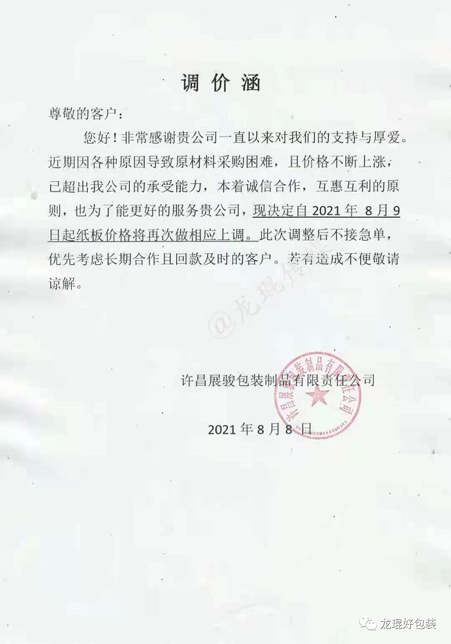 據了解,河南省,尤其是鄭州市,近段時間先是遭遇特大暴雨,達到千年一遇的規模;后是疫情擴散,截至8月8日18時,鄭州市新增本土確診病例1例,原無癥狀轉確診40例,新增無癥狀感染者1例。暴雨和疫情的連番襲來,令企業生產和成品紙運輸受到影響。 部分紙板廠進行第二輪上漲 與極端天氣相比,疫情防控是一項長期的工作。除河南省鄭州市外,其余地區也受到疫情不同程度的影響。同時,各類包裝紙種近期均出現50-200元/噸的漲幅,加劇了下游包裝企業的經營壓力。因此,紙板漲價函在這幾天紛至沓來。 據筆者統計,目前紙板漲價潮已涵蓋國內眾多地區,尤其以華東、華中地區漲勢最為迅猛。初期,紙板漲幅為3%左右,發展至今,河南地區的紙板單次漲幅高達7%,另有多個省市的紙板廠已經發出了本月的第二份漲價函。 部分新增紙板漲價函 許昌展駿包裝制品有限責任公司 自2021年8月9日起,紙板價格將再次上調。