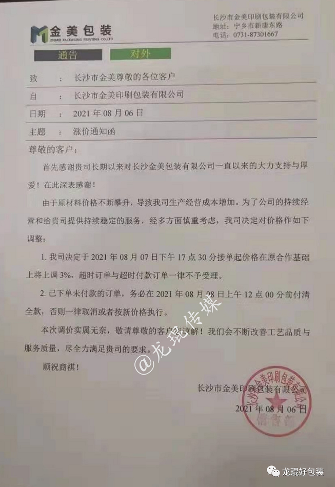 長沙金美印刷包裝有限公司 從8月7日17點半接單起,在原合作基礎上將上調3%。