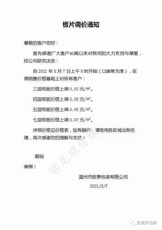 溫州市歐泰包裝有限公司 從8月7日上午8點開始,三層紙板上調0.03元/平方,四層紙板上調0.05元/平方,五層紙板上調0.05元/平方,七層紙板上調0.07元/平方。