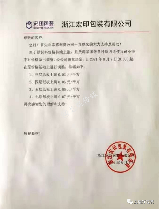 浙江宏印包裝有限公司 從8月7日起,三層紙板上調0.03元/平方,四層紙板上調0.05元/平方,五層紙板上調0.05元/平方,七層紙板上調0.07元/平方。
