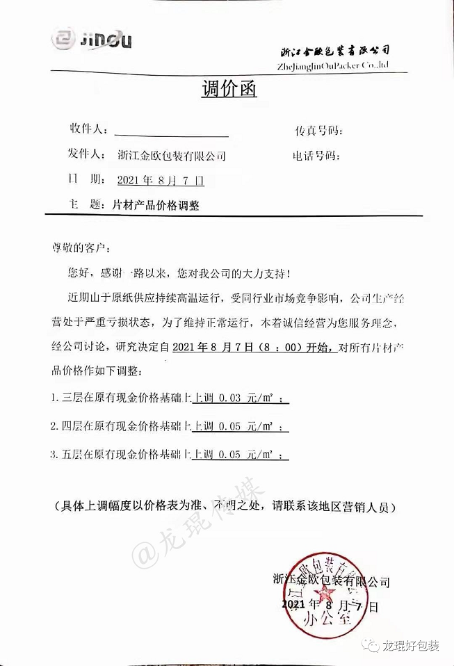 浙江金甌包裝有限公司 從8月7日8點開始,三層紙板上調0.03元/平方,四層紙板上調0.05元/平方,五層紙板上調0.05元/平方。