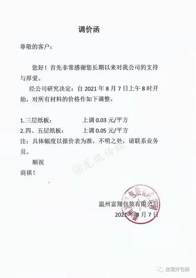 溫州富翔包裝有限公司 從8月7日上午8點開始,三層紙板上調0.03元/平方,四、五層上調0.05元/平方。