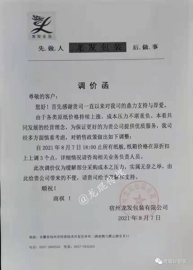 宿州龍發包裝有限公司 從8月7日18點開始,紙板、紙箱價格在原折扣基礎上上調3個點。