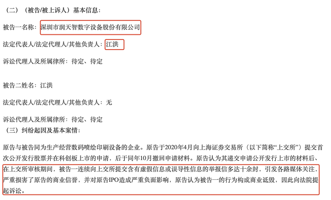 近日,新三板掛牌企業潤天智發布公告,稱漢弘集團以商業詆毀罪起訴公司,索賠金額1億。 深圳漢弘數字印刷集團股份有限公司(文中簡稱“漢弘集團”),就是上述IPO被舉報后撤回上市申請的公司。去年4月,漢弘集團遞交了上市申請,7個月后又主動撤回。今年7月,中金公司于深圳證監局披露了對漢弘集團的輔導備案信息。 這一次,漢弘集團先發制人,打算在輔導期“了結”與潤天智的“同行相殺”案。 8月26日,潤天智董秘辦工作人員對時代財經表示,公司目前還未收到立案通知書,僅從網上查詢到了涉訴信息。“在與督導機構和律師事務所溝通后我們決定先發布公告,案件目前還沒有開庭。” 對于此前狀告漢弘集團侵犯公司商業機密一案,該工作人員稱,“深圳市中級人民法院于2020年11月對此案件作出裁決,發回深圳龍崗區人民法院重審,目前案件還在審理中,并未公布最終裁決。” 潤天智成立于2000年,主營業務為數碼打印機等噴墨印刷設備的研發、生產和銷售。 漢弘集團則是潤天智的“后輩”,成立于2012年,同樣是生產經營數碼噴繪印刷設備的企業。 8月17日,潤天智發布公司被漢弘集團起訴的公告,一同被列為被告人的還有潤天智董事長江洪。 糾紛起因來自于2020年4月份漢弘集團向上交所遞交首次公開發行股票并在科創板上市的申請以來,潤天智連續向上交所提交了多達十余封舉報信。 漢弘集團認為,這些舉報信含有虛假信息或誤導性信息,并引發各路媒體關注,嚴重損害了公司的商業信譽,并對公司IPO造成嚴重負面影響。