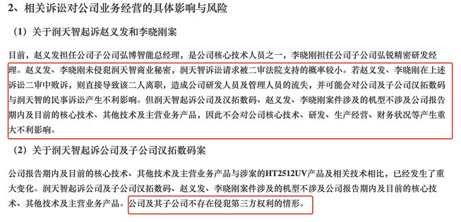 潤天智公布的部分舉報信。 2020年6月,潤天智對深圳市漢拓數碼有限公司(以下簡稱為“漢拓數碼”)及其股東漢弘集團發起訴訟,要求其停止侵犯原告涉案技術秘密并賠償經濟損失1.09億元。 在此之前,潤天智已經對漢弘集團核心技術人員趙義發、李曉剛展開了長達十年的舉報及訴訟。這兩位技術人員在2009年、2010年相繼從潤天智離職并加入了漢弘集團旗下子公司漢拓數碼。2011年,潤天智向深圳市公安局舉報上述人員侵犯商業機密。 這起案件的進展可謂曲折,中間經過多次知識產權和技術相關的鑒定所對案件的鑒定。但潤天智并沒有得到“正義伸張”,2018年,深圳市龍崗區檢察院兩次退回偵查機關補充偵查,并在2019年作出裁定,以證據不足駁回了潤天智的起訴。 眼看著涉嫌侵犯自家商業機密的公司即將上市,潤天智打算最后一搏,從起訴個人變為直接狀告公司,并發起多次舉報。 截至發稿日,不論是潤天智起訴漢弘集團侵犯商業機密的案件,還是漢弘集團反訴潤天智商業詆毀,兩起案件都未開庭審理。 而對于此前狀告漢弘集團侵犯公司商業機密一案,工作人員回復稱,“深圳市中級人民法院于2020年11月對此案件作出裁決,發回深圳龍崗區檢察院重審,目前案件還在審理中,并未公布最終裁決。” 去年,在案件引發了大批媒體及公眾的關注后,上交所科創板上市委在對漢拓集團的兩輪問詢中也重點提到了關于商業機密糾紛的問題。 與潤天智大張旗鼓舉報、訴訟不同的是,漢弘集團當時對于此案件的回復相對克制,只在問詢回復中作出表態稱,潤天智主張的商業秘密不屬于噴墨印刷設備的核心技術,趙、李二人和漢拓不存在侵犯潤天智商業秘密的行為。