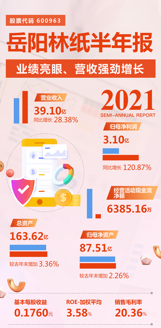 2021年上半年,岳陽林紙堅持以高質量發展統攬全局,盯緊生產經營目標不動搖,統籌抓好生產、經營和改革發展各項工作,經營業績創新高。 截至2021年6月30日,岳陽林紙總資產163.62億元,歸屬于母公司股東的權益87.51億元;2021年上半年實現營業收入39.10億元,歸屬于母公司股東的凈利潤31,022.78萬元,較上年同期增長120.87%。 管理創效,打造堅實基本面。依托中國紙業集采平臺,降低原材料采購價格;生產持續穩定向好,成本保持低位;充分發揮紅色基因優勢,黨政出版中標量同比大幅提升;有效開展PMO項目管理工作,充分挖掘效益潛力。 改革助力,點亮多項創新點。按照“五突破一加強”的思路,縱深推進“雙百行動”綜合改革,為企業發展增活力、添動力。其中,限制性股票激勵計劃完成首次授予登記3,553.50萬股,涉及激勵對象283人,6月24日發布了授予完成結果公告;子公司雙陽高科股權激勵計劃方案也已落地實施。 黨建促進,助推經營思路產生綜合效益。圍繞“融”字,在“促”與“化”字著手,加強黨的全面領導,發揮好“把方向,管大局,保落實”作用。黨建工作創品牌,黨史學習教育出活力,廉政建設出治理效能。