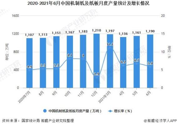 2020-2021年6月中國機制紙及紙板累計產量統計及增長情況