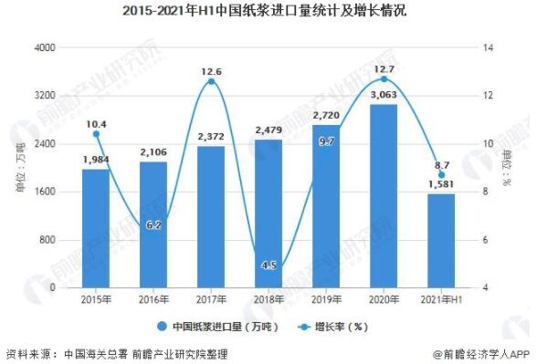 2015-2021年H1中國紙漿進口金額統計及增長情況