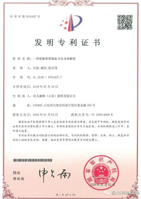 近日,日照市政府發(fā)布了《關(guān)于公布2020年度日照市專利獎(jiǎng)勵(lì)的決定》(日政字[2021]73號(hào)),亞太森博(山東)漿紙有限公司完成的“一種溶解漿的制備方法及溶解漿”發(fā)明專利,榮獲日照市專利獎(jiǎng)二等獎(jiǎng)。