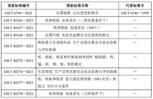 2021年發布的GB/T 6546—2021《瓦楞紙板 邊壓強度的測定》等9項造紙領域國家標準已于本月實施,請各相關單位積極執行新標準。