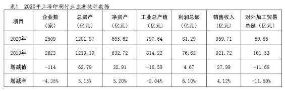 2020年,上海印刷業(yè)總資產(chǎn)達(dá)到1281.97億元,比2019年增長(zhǎng)5.15%,上海印刷業(yè)全行業(yè)工業(yè)總產(chǎn)值為797.64億元,銷售收入和利潤(rùn)總額雙雙呈現(xiàn)增長(zhǎng)。 基本概況 2020年上海印刷業(yè)不僅在抗擊疫情中發(fā)揮出中流砥柱的作用,行業(yè)發(fā)展情況同樣超出預(yù)期。 截至2021年4月,上海通過年度報(bào)告的印刷企業(yè)共2509家(不含打印、復(fù)印企業(yè)),比2019年同口徑的2623家減少了114家,下降4.35%;相比2019年對(duì)2018年5.00%的下降率,企業(yè)數(shù)量減少的速度進(jìn)一步降低,且減少的企業(yè)主要集中于年工業(yè)總產(chǎn)值為1000萬元以下的企業(yè)。 2020年,市場(chǎng)對(duì)于上海印刷業(yè)的發(fā)展表現(xiàn)出極大的信心,企業(yè)投資規(guī)模仍然進(jìn)一步擴(kuò)大。2020年,上海印刷企業(yè)總資產(chǎn)共計(jì)1281.97億元,比2019年增長(zhǎng)5.15%,凈資產(chǎn)為665.62億元,比2019年增長(zhǎng)5.20%。不難看出,投資已經(jīng)大于當(dāng)年的行業(yè)GDP增長(zhǎng)。