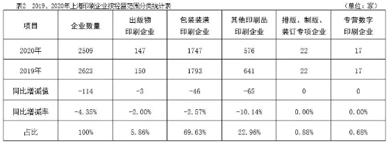 2020年,上海印刷業(yè)全行業(yè)工業(yè)總產(chǎn)值為797.64億元,比2019年下降2.04%,但是銷售收入和利潤(rùn)總額卻雙雙呈現(xiàn)增長(zhǎng),其中銷售收入為959.71億元,比2019年增長(zhǎng)4.12%;利潤(rùn)總額為81.29億元,比2019年增長(zhǎng)6.10%,整個(gè)印刷業(yè)仍然保持較高的盈利能力。由于疫情的影響,2020年對(duì)外加工貿(mào)易額下降了11.50%,總額為89.85億元,比2019年減少了11.68億元。 1.按企業(yè)經(jīng)營(yíng)范圍分類(詳見表2) ●出版物印刷企業(yè)為147家,占企業(yè)總數(shù)的5.86%,比2019年減少3家,下降4.35%; ●包裝裝潢印刷企業(yè)為1747家,占企業(yè)總數(shù)的69.63%,比2019年減少46家,下降2.57%; ●其他印刷品印刷企業(yè)為576家,占企業(yè)總數(shù)的22.96%,比2019年減少65家,下降10.14%; ●排版、制版、裝訂專項(xiàng)企業(yè)為22家,占企業(yè)總數(shù)的0.88%,與2019年持平; ●專營(yíng)數(shù)字印刷企業(yè)為17家,占企業(yè)總數(shù)的0.68%,與2019年持平。