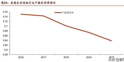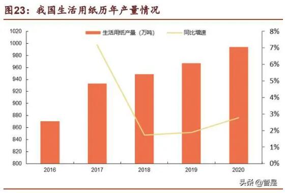 判斷未來市場規(guī)模的因素 1——量增。由于人均生活用紙消費(fèi)量與人均 GDP 正相 關(guān),故假設(shè)兩者未來增速一致,根據(jù)世界銀行對(duì)中國 GDP 的預(yù)測,2021 年增速為 7.9%,2022 年增速為 5.2%;由于放開二胎政策當(dāng)年出生率提升 0.158 個(gè)百分點(diǎn), 第二年回落 0.093 個(gè)百分點(diǎn),而后幾年持續(xù)下滑,三胎政策較二胎政策對(duì)人口增速 影響較小,我們預(yù)計(jì) 2021-2023 人口增長率為 0.24%、0.19%、0.14%,則 2021- 2023 年我國生活用紙消費(fèi)量增長率分別為 8.16%、5.4%、5.35%。 疫情促使人們提升健康觀念,生活用紙行業(yè)消費(fèi)量有望進(jìn)一步提升。受新冠肺炎疫 情的影響,消費(fèi)者對(duì)個(gè)人衛(wèi)生和安全防護(hù)的意識(shí)增強(qiáng),消毒濕巾等一次性抗菌安全 性紙質(zhì)用品的市場需求大幅提升。同時(shí),隨著人們對(duì)生活用紙消費(fèi)觀念的升級(jí),市 場上不斷推出更安全衛(wèi)生的生活用紙產(chǎn)品。疫情常態(tài)化趨勢下,消費(fèi)者對(duì)此類高品 質(zhì)生活用紙已有所依賴,疫情后時(shí)代的生活用紙行業(yè)消費(fèi)量有望進(jìn)一步提升。 判斷未來市場規(guī)模的因素 2——價(jià)增。我國生活用紙行業(yè)多家企業(yè)均宣布,受原材料價(jià)格上漲影響,于今年調(diào)升部分產(chǎn)品價(jià)格。根據(jù)卓創(chuàng)資訊統(tǒng)計(jì)的生活用紙企業(yè)報(bào) 價(jià)顯示,2021 年 1-11 月較 2020 年價(jià)格提升在 3-12%之間。我們預(yù)計(jì) 2021 年市 場均價(jià)提升 5%,之后主要考慮通貨膨脹率,我們預(yù)計(jì) 2022 年市場均價(jià)提升 3%, 2023 年保持在 3%,計(jì)算得出,我國生活用紙行業(yè)市場規(guī)模 2021-2023 年增速分 別為 13.57%、8.57%、8.51%。 3、 供給端:產(chǎn)能過剩趨勢明顯 環(huán)保政策的實(shí)施或?qū)⑻嵘袠I(yè)集中度 國內(nèi)生活用紙行業(yè)產(chǎn)能、產(chǎn)量穩(wěn)步提升。我國生活用紙行業(yè)產(chǎn)能、產(chǎn)量均逐年提升, 2018 年受宏觀經(jīng)濟(jì)下行的影響,增速有所放緩。2016-2020 年產(chǎn)能年均復(fù)合增長 率為 7.64%,產(chǎn)量年均復(fù)合增長率為 3.37%,產(chǎn)能增速明顯高于產(chǎn)量,產(chǎn)能過剩趨 勢愈發(fā)明顯。