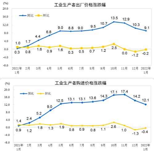 近日,國家統(tǒng)計局發(fā)布2022年1月份工業(yè)生產(chǎn)者出廠價格變動情況。2022年1月份,全國工業(yè)生產(chǎn)者出廠價格同比上漲9.1%,環(huán)比下降0.2%;工業(yè)生產(chǎn)者購進價格同比上漲12.1%,環(huán)比下降0.4%。