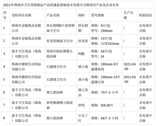 據(jù)廣東省珠海市人民政府網(wǎng)站消息,2021年第四季度,珠海市市場(chǎng)監(jiān)督管理局組織開展了衛(wèi)生用紙制品產(chǎn)品質(zhì)量監(jiān)督抽查。本次抽查僅涉及生產(chǎn)領(lǐng)域企業(yè),3家受檢單位8批次產(chǎn)品,其中紙尿褲產(chǎn)品4批次,衛(wèi)生巾產(chǎn)品4批次,均未發(fā)現(xiàn)不合格產(chǎn)品。
