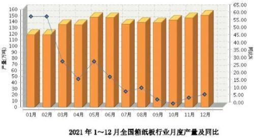箱紙板產量1680萬噸 在箱紙板部分,2021年1-12月份,全國箱紙板累計完成產量1680.40萬噸,同比增長19.97%。