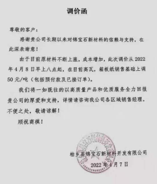 從3月底開始的原紙漲價潮延續至今,仍未消散。4月7日,東莞玖龍紙業、福建聯盛紙業、柏鄉縣華興紙業、柏鄉縣錦寶石新材料等多家紙企上漲50-100元/噸,涉及瓦楞紙、箱板紙、白板紙等多個包裝紙品類。 柏鄉縣錦寶石新材料開發有限公司:
