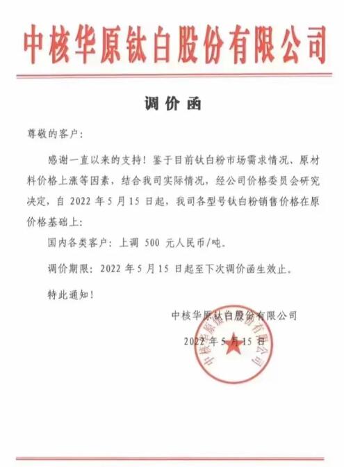 此前,中核鈦白也發布發布調價函,稱5月15日起各型號鈦白粉的銷售價格在原價格基礎上,國內各類客戶上調500元/噸。