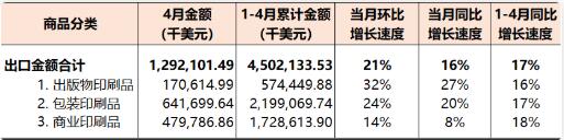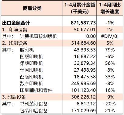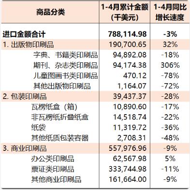 2022年1-4月,國內印刷器材進出口貿易順差2.45億美元(同比增長108%)。 本期觀察 受國內外多重因素影響,國內印刷產業相關商品進出口貿易保持平穩運行的壓力顯著增加。2022年1-4月國內印刷品、印刷裝備、印刷器材三大類商品進出口雖然保持了8%的同比增長速度,但其相關商品的進口和出口則呈現出與去年不同的運行特點: 三大類商品進口速度均相對萎縮:1-4月份,國內印刷產業相關商品進口同比下降12%。其中,印刷品進口同比下降3%、印刷裝備同比下降21%、印刷器材同比下降11%。 印刷品、印刷器材出口大幅增長、印刷裝備出口下降:在三大類商品進口均從處下降的同時,國內印刷品出口增長17%、印刷器材出口增長39%,而印刷裝備出口下降1%。 亞洲市場穩定、歐洲和北美的市場更加鞏固:1-4月份,國內印刷品、印刷裝備、印刷器材進出口在亞洲、歐洲和北美洲三大區域市場的分布為,亞洲43%、歐洲23%、北美洲24%。與去年同期相比(相關進出口規模),亞洲市場增長2%、歐洲市場增長10%、北美洲市場增長17%。 與2021年同期相比,2022年1-4月國內印刷品、印刷裝備、印刷器材進口和出口增長較快的前五個商品商品類別如下: 進口:期刊及雜志類印刷品(+306%)、柔版印刷機(+242%)、PS膠印版材(+58%)、辦公類印刷品(+5%)、水性噴墨墨水(+2%); 出口:膠印機(+79%)、柔版印刷機(+56%)、CTP膠印版材(+54%)、PS膠印版材(+40%)、紙袋(+32%)。 同期,國內印刷品、印刷裝備、印刷器材進口和出口相對萎縮的前五個商品商品類別如下: 進口:凸印機(-98%)、CTP膠印版材(-81%)、兒童圖畫書類印刷品(-78%)、其他出版物印刷品(-72%)、包裝印后設備(-51%); 出口:其他出版物印刷品(-58%)、票證類印刷品(-57%)、期刊及雜志類印刷品(-49%)、書刊裝訂設備(-20%)、柔印版材(-19%)。