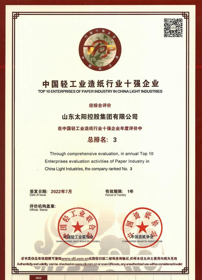 近期,中國造紙協(xié)會公布了《關(guān)于表彰“2021年度中國輕工業(yè)造紙行業(yè)十強企業(yè)”的決定》,太陽紙業(yè)控股股東山東太陽控股集團(tuán)有限公司榮獲“2021年度中國輕工業(yè)造紙行業(yè)十強企業(yè)”稱號,彰顯了太陽控股在高質(zhì)量發(fā)展之路上奮勇前行的積極成效。