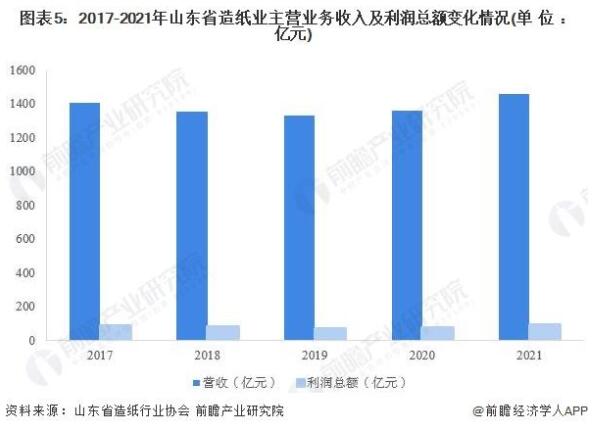 從行業(yè)經(jīng)營(yíng)效益來(lái)看,2017年以來(lái),山東省造紙業(yè)主營(yíng)收入呈現(xiàn)先降后升的趨勢(shì),2021年,全省造紙業(yè)實(shí)現(xiàn)營(yíng)收1455億元,同比增長(zhǎng)6.98%,創(chuàng)近六年新高。
