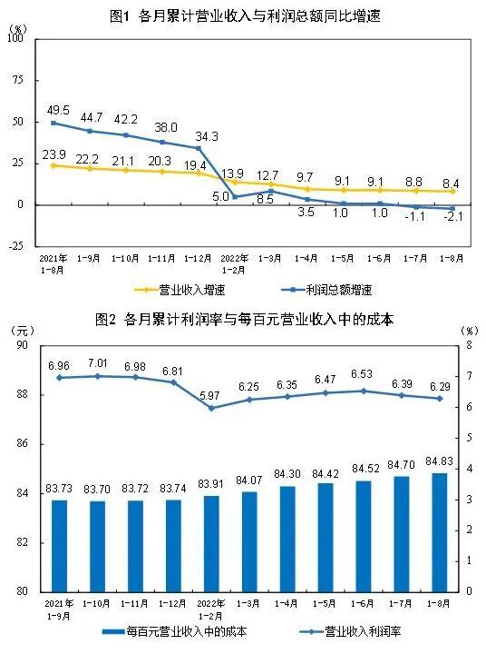 近日,國家統計局網站發布2022年1-8月份全國規模以上工業企業利潤。同期,國家統計局工業司高級統計師朱虹就數據情況進行了解讀。 數據顯示,1—8月份,全國規模以上工業企業實現利潤總額5.53萬億元,同比下降2.1%。 1—8月份,在41個工業大類行業中,16個行業利潤總額同比增長,25個行業下降。 值得關注的是,造紙和紙制品業實現營業收入9746.8億元,同比增長1.8%;利潤總額326.5億元,同比下降43.3%。印刷和記錄媒介復制業實現營業收入4785.6億元,同比增長1.3%;利潤總額235.8億元,同比下降5.3%。 1—8月份,規模以上工業企業實現營業收入87.89萬億元,同比增長8.4%;發生營業成本74.56萬億元,增長9.7%;營業收入利潤率為6.29%,同比下降0.67個百分點。 8月末,規模以上工業企業資產總計150.99萬億元,同比增長9.6%;負債合計85.76萬億元,增長10.0%;所有者權益合計65.23萬億元,增長9.2%;資產負債率為56.8%,同比提高0.2個百分點。 1—8月份,規模以上工業企業每百元營業收入中的成本為84.83元,同比增加1.04元;每百元營業收入中的費用為7.91元,同比減少0.51元。 8月末,規模以上工業企業每百元資產實現的營業收入為89.9元,同比減少1.4元;人均營業收入為176.2萬元,同比增加15.3萬元;產成品存貨周轉天數為18.3天,同比增加0.8天;應收賬款平均回收期為54.4天,同比增加2.9天。