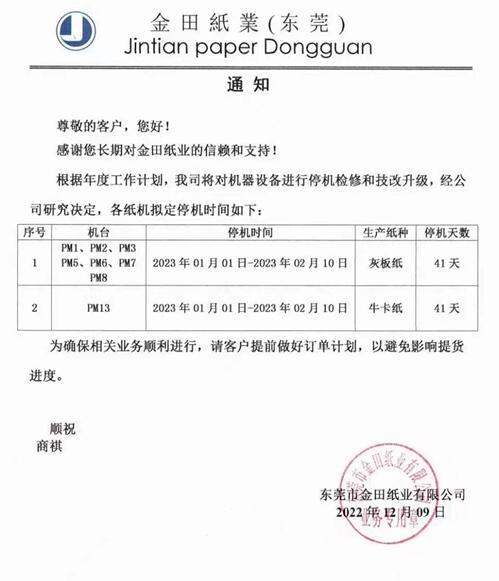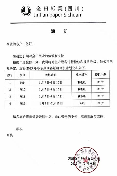 日前,金田紙業發布通知稱,其東莞、江蘇、四川三大生產基地的15臺紙機將在2023年1月份—2月份停機檢修,各臺紙機的停機時長為35—41天。 東莞基地 PM1、PM2、PM3、PM5、PM6、PM7、PM8共七臺灰板紙機,以及?垯CPM13均將在2023年1月1日—2023年2月10日停機41天。