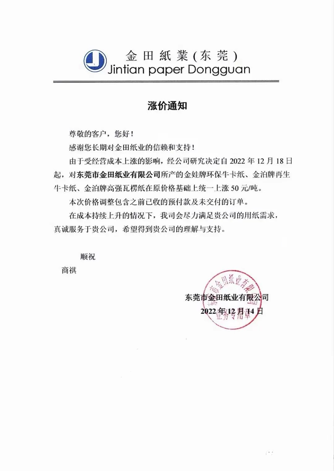 12月14日,東莞市金田紙業發布漲價通知:從12月18日起,對公司所產的金娃牌環保牛卡紙、金泊牌再生牛卡紙、金泊牌高強瓦楞紙在原價格基礎上統一上漲50元/噸。本次價格調整包含之前已收的預付款及未交付的訂單。