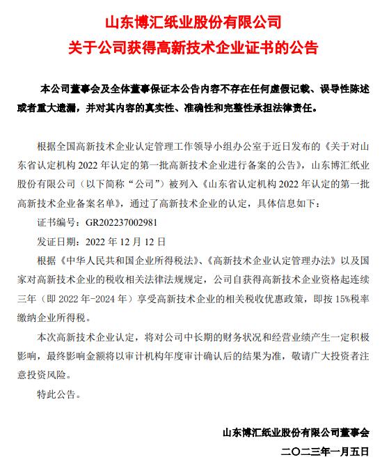 根據(jù)全國高新技術企業(yè)認定管理工作領導小組辦公室于近日發(fā)布的《關于對山東省認定機構(gòu)2022年認定的第一批高新技術企業(yè)進行備案的公告》,山東博匯紙業(yè)股份有限公司被列入《山東省認定機構(gòu)2022年認定的第一批高新技術企業(yè)備案名單》,通過了高新技術企業(yè)的認定。