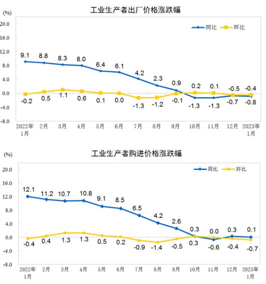 2023年1月份,全國工業生產者出廠價格同比下降0.8%,環比下降0.4%;工業生產者購進價格同比上漲0.1%,環比下降0.7%。