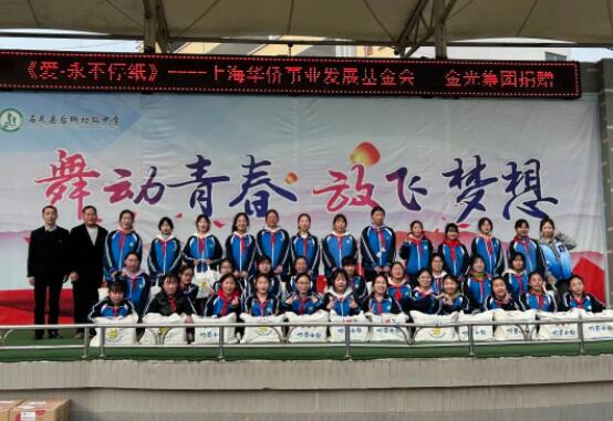后柳初級中學(xué)學(xué)生合照 儀式當(dāng)天,金光集團(tuán)APP(中國)通過上海市華僑事業(yè)發(fā)展基金會(huì)為后柳初級中學(xué)275名女童捐贈(zèng)共計(jì)24000元的385箱物資。后柳中學(xué)校方負(fù)責(zé)人表示,僑愛課堂為關(guān)愛女童身心健康探索新路,開啟后柳中學(xué)助學(xué)活動(dòng)新紀(jì)元。 “愛·永不停紙”僑愛課堂——關(guān)愛生理期留守女童項(xiàng)目于2020年正式啟動(dòng),除了后柳中學(xué),云南、廣西、重慶、甘肅等地的多所中學(xué)的孩子們也將獲得生理衛(wèi)生用品的捐贈(zèng)。